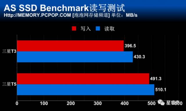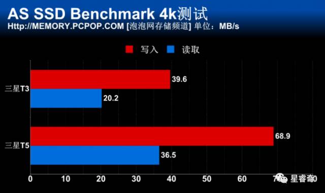 AS SSD Benchmark測試下,也反應(yīng)了同樣的成績,三星的T5相比T3有了極大提升,讀取與寫入都要相比老一代產(chǎn)品提升100MB/s左右,而4k成績則將近翻倍了。