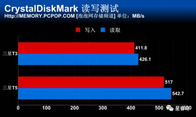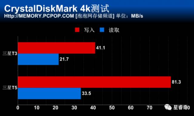 CrystalDiskMark測試中,三星的T5移動SSD讀取達(dá)到542.7MB/s,寫入達(dá)到517MB/s。而上一代的T3的成績則只有426.1MB/s和411.8MB/s。4K成績上,三星T5也提升明顯,4K讀取達(dá)到了81.3MB/s,4K寫入33.5MB/s,相比T3的41.1MB/s和21.7MB/s要出色的多。