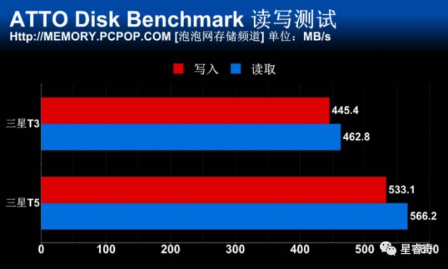 ATTO Disk Benchmark測試下,三星的T5移動SSD讀取達(dá)到566.2MB/s,寫入達(dá)到533.1MB/s。而上一代的T3的成績則只有462.8MB/s和445.4MB/s。速度上提升非常明顯。